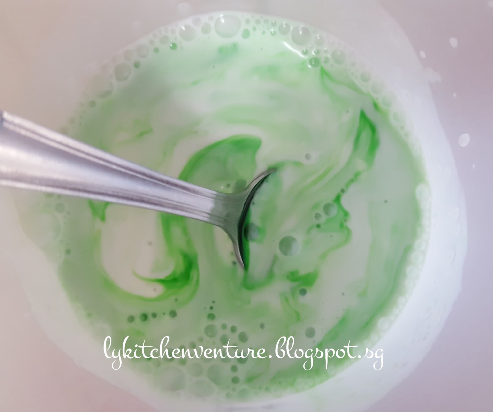 6. Add in the coconut-pandan mixture and stir to combine. (Do not panic if you see the batter becoming thick and lumpy)