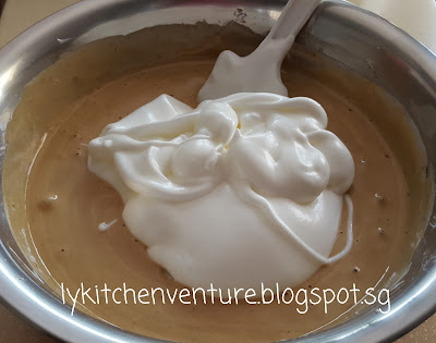 11. Then add in the balance 1/3 of the meringue and gently fold the meringue into the cake batter until well blended.