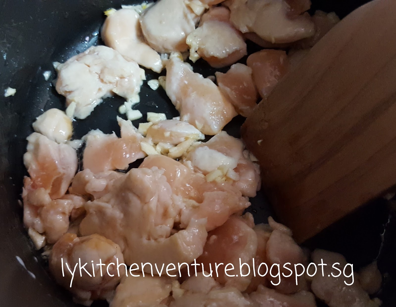 4. When chicken is about half cooked, add in minced garlic and continue to fry until fragrant and chicken is browned.
